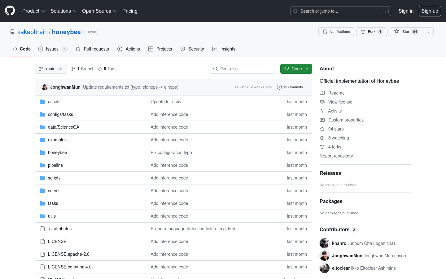 Honeybee是一种多模态LLM(大型语言模型)的局部增强投影仪,由Junbum Cha、Wooyoung Kang、Jonghwan Mun和Byungseok Roh开发。它使用PyTorch 2.0.1环境,并提供了推理代码、检查点、训练代码、模型动物园和与其他SoTA方法的比较。它还提供了严格复制官方结果的方法,以及推理和演示的示例代码。此外,Honeybee的预训练权重受CC-BY-NC 4.0许可协议保护。