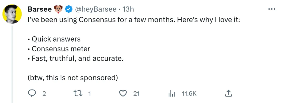 推特博主 @heyBarsee 表示,他使用 Consensus 已经有一段时间了,在使用过程中它有着很不错的表现,具体如下:
