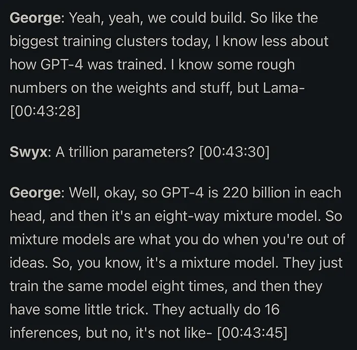 还有人说,如果真的像 George Hotz 说的那样,GPT-4 是一个由 8 个 2200 亿参数的专家模型组合的混合模型,那很难想象背后的推理成本有多高。