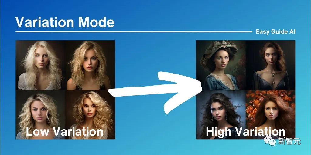 在prompt中使用「低变化」模式,就能生成一致的角色形象,而如果选择「高变化」,就会导致与原始输出的较大的视觉差别,四张图片就会更加具有创意和艺术表现力。