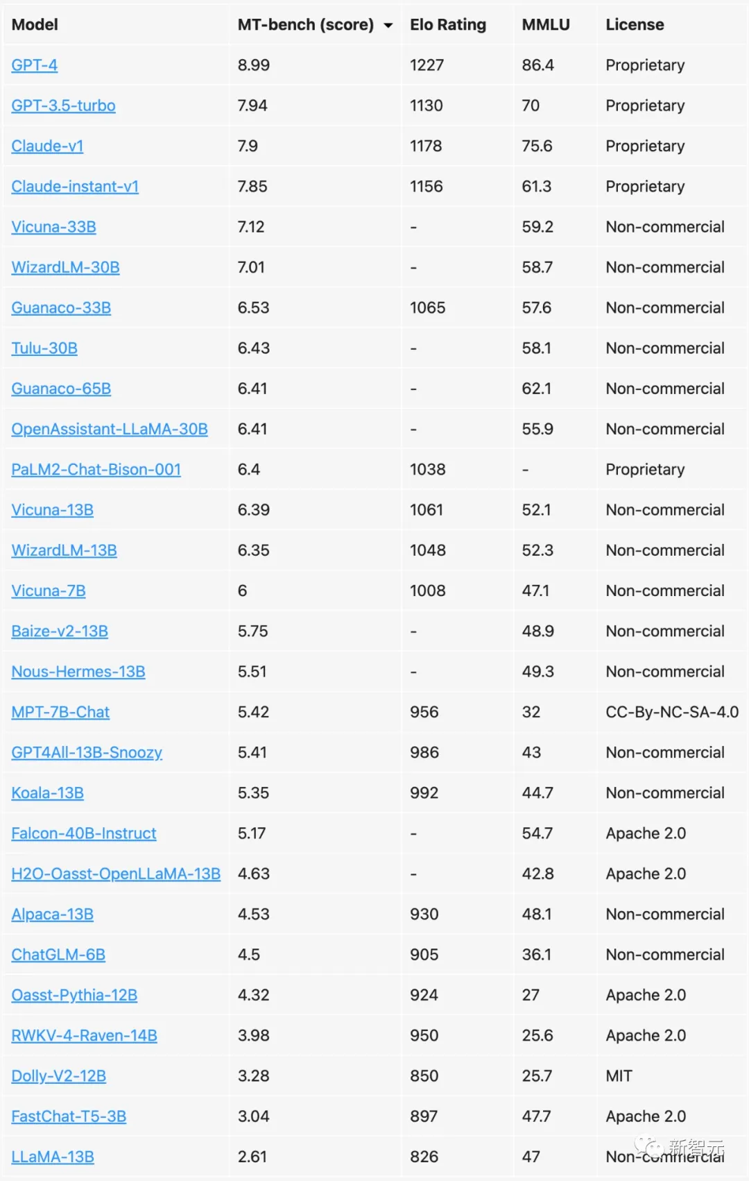 增强版LLM排行榜不难看出,GPT-3.5、Claude-v1和Claude-instant-v1这三个模型之间实际难分伯仲。不仅在MT-bench得分上咬得很紧,而且在诸如Elo和MMLU得分上还有后者还有反超。和这些专有模型相比,开源模型们则有着明显的差距,即便是作为开源第一的Vicuna-33B也是如此。当然,事情总有例外。比如谷歌的PaLM2,就落后于一众开源模型。