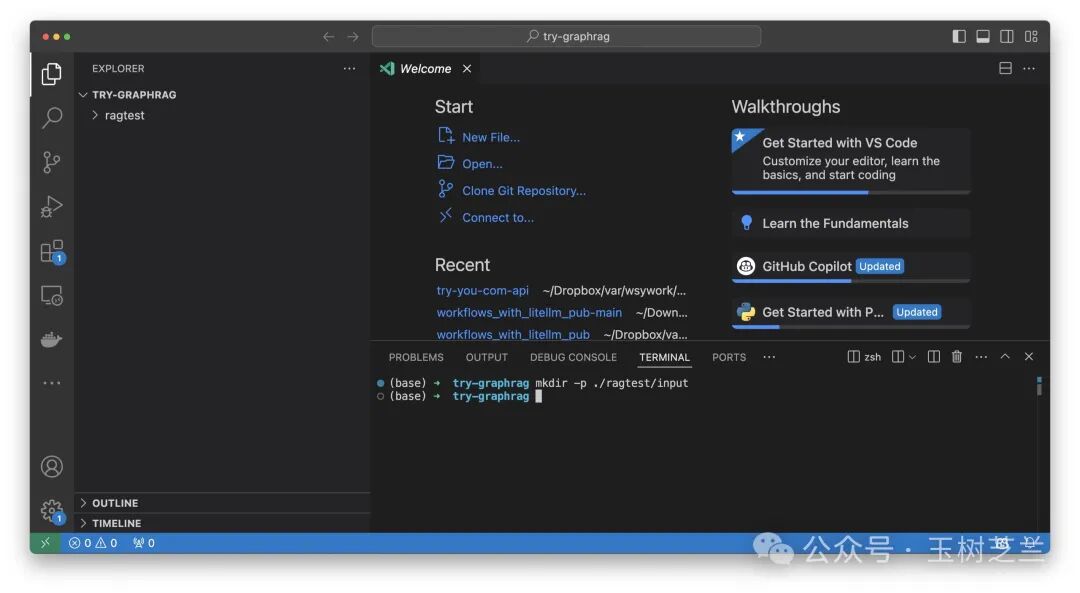 首先,我们需要把 GraphRAG 安装上,这里使用 pip install ,非常简单。